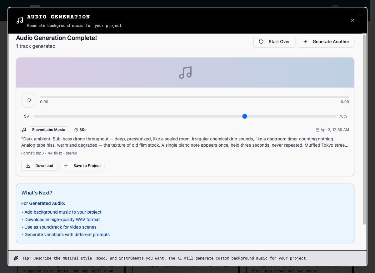 Click Generate Audio. Generation typically takes 30–60 seconds. When complete, a preview player appears. Click Save to Project to attach the track to your project.
