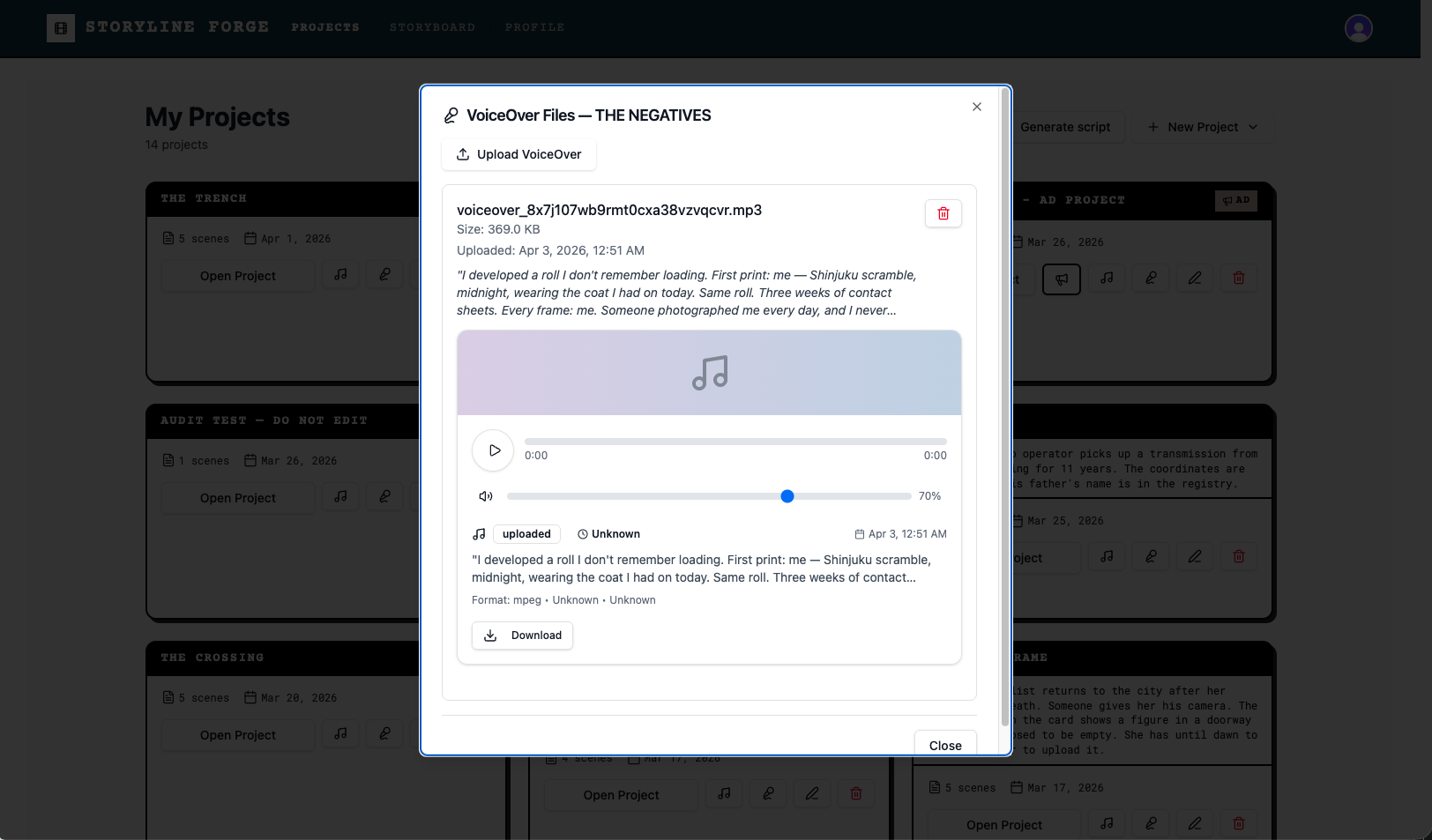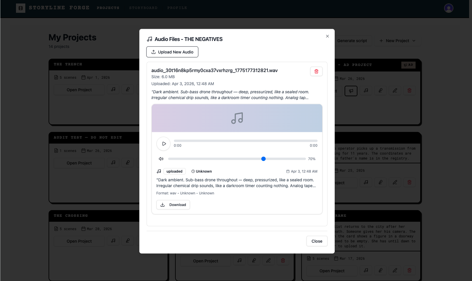 Storyline Forge lets you add background music and a voiceover narration to any project. Both are generated by AI from a text description you provide Both are attached to your project from the Projects page, and are not accessed from inside the storyboard workspace.