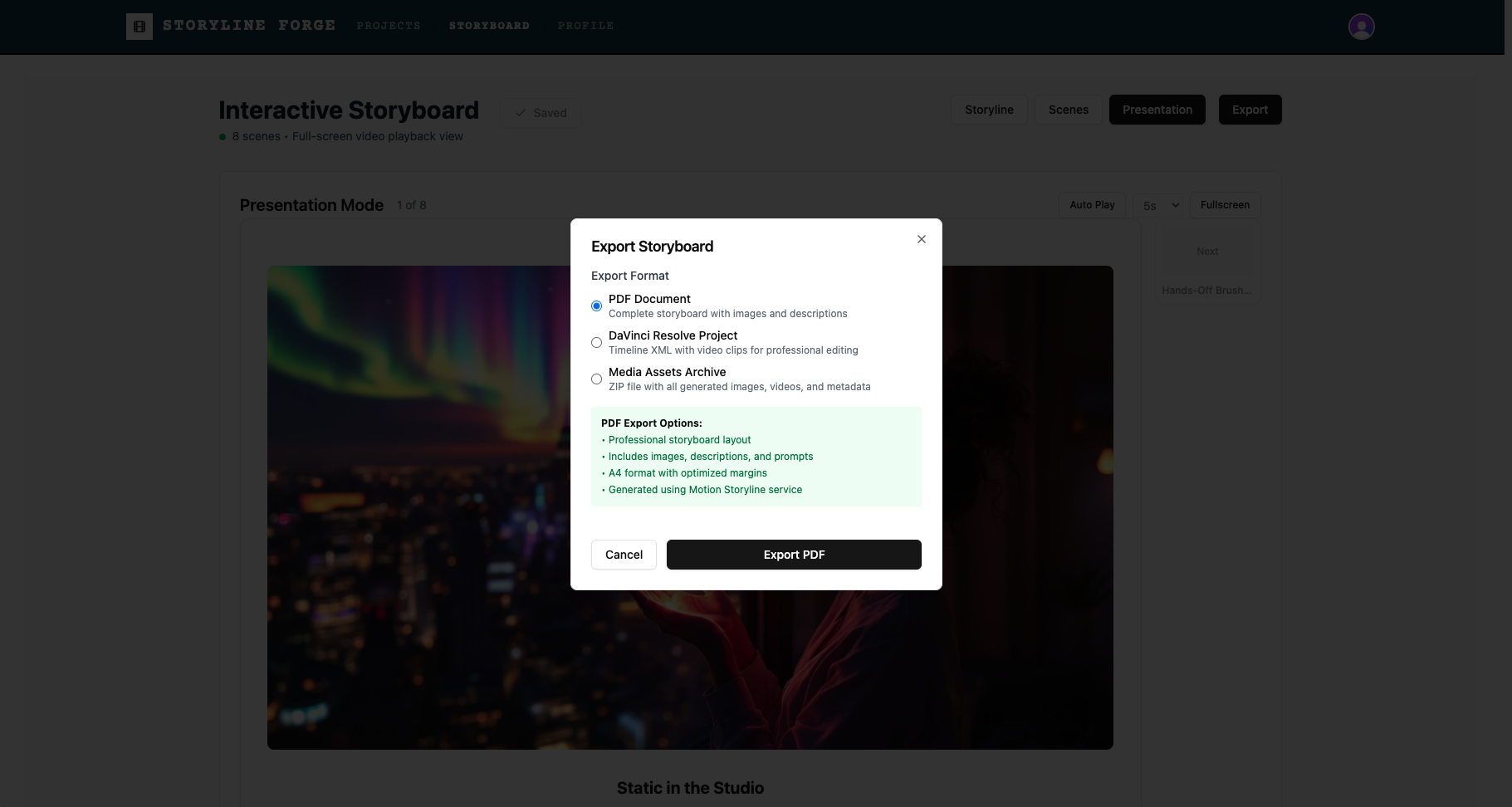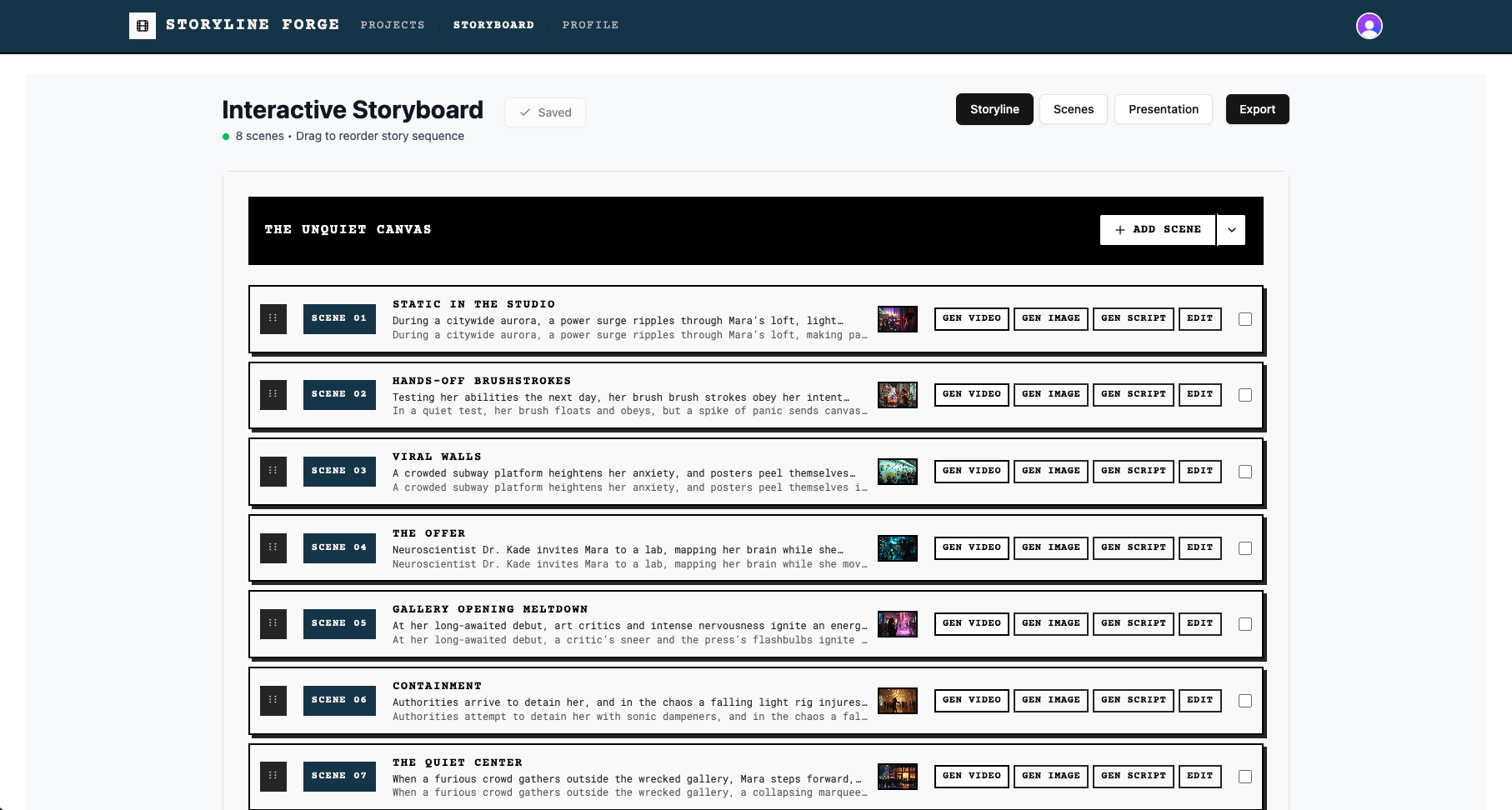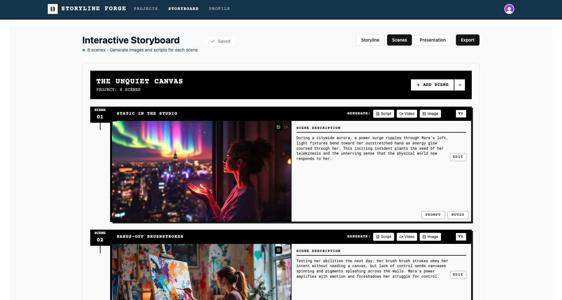 Storyline: Forge is a rapid iteration organization tool for generated content. You can easily create stories or narratives using or getting ideas from AI tools, or you can write on your own and use media assets you have created.